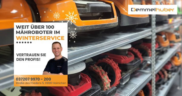 Der Winter ist da, und bei uns in der Werkstatt herrscht Hochbetrieb: Über 100 Mähroboter haben ihren Weg zu uns gefunden, um einen professionellen Winterservice zu durchlaufen.