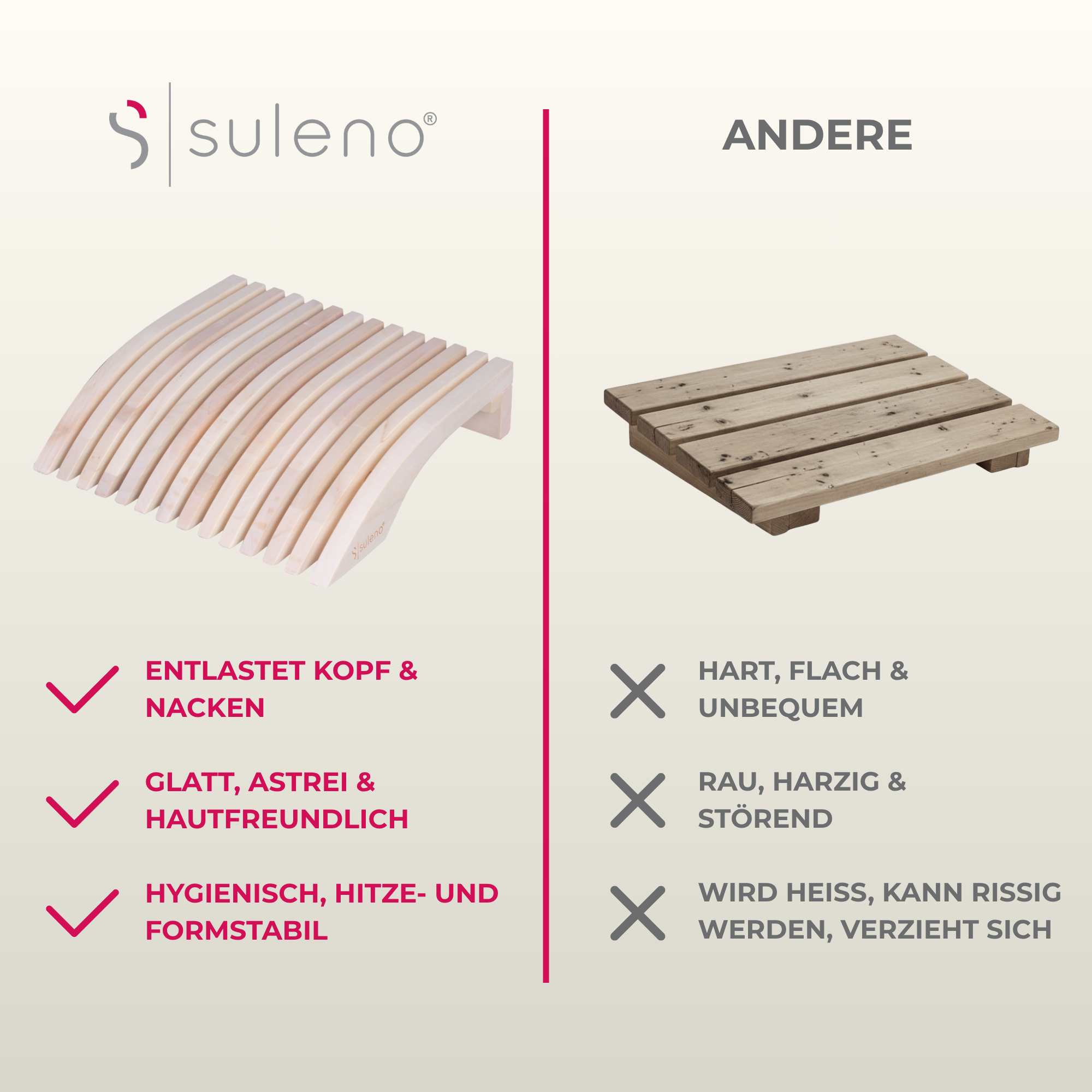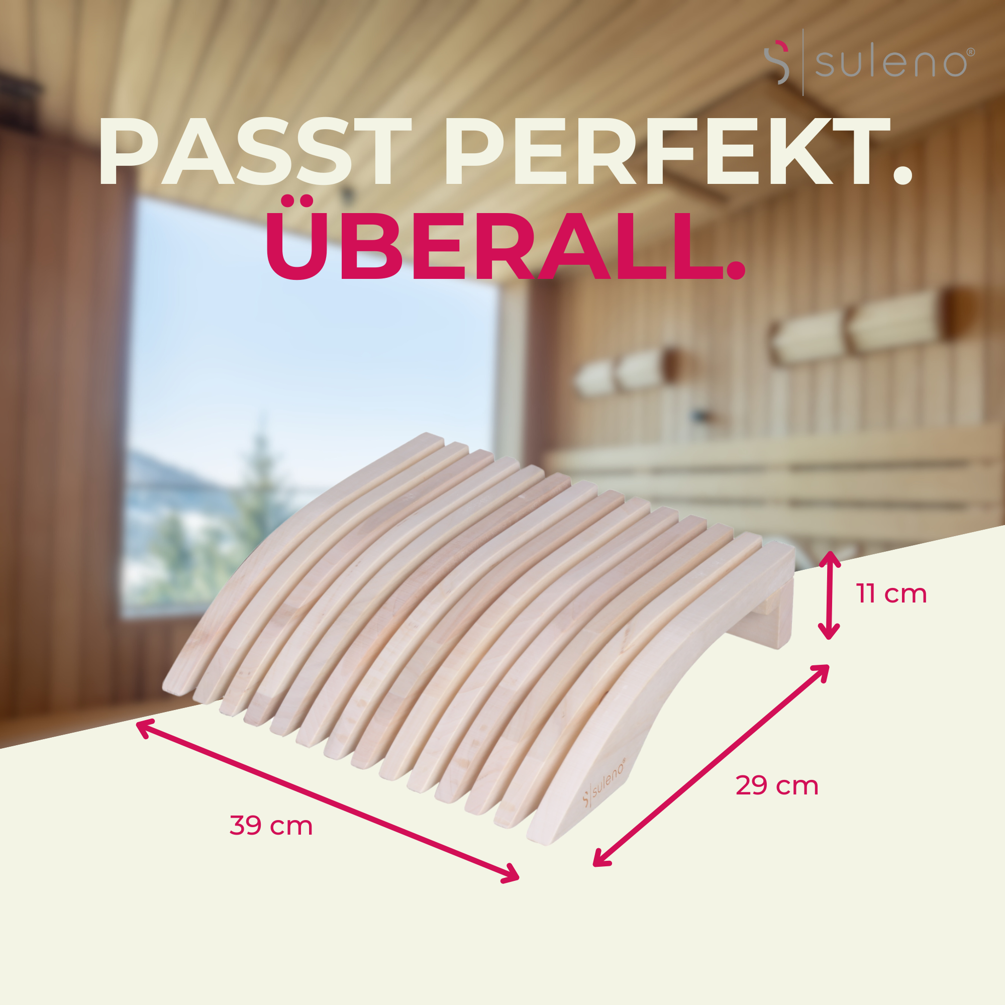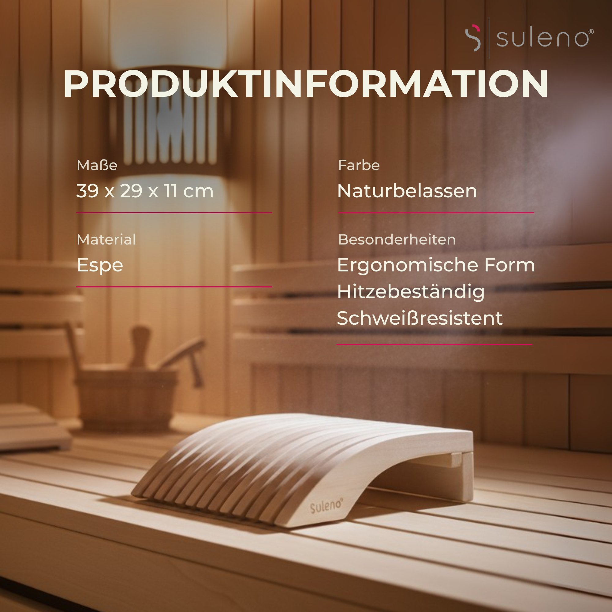 Erleben Sie ultimativen Komfort und Entspannung mit der Suleno ESKE Sauna Kopfstütze, einem unverzichtbaren Bestandteil Ihres Saunazubehörs. Diese ergonomische Kopfstütze wurde speziell entwickelt, um Kopf und Nacken optimal zu stützen, sodass Sie Ihre wohlverdiente Ruhe in der Sauna voll und ganz genießen können. Hergestellt aus hochwertigem Espe-Holz, das bekannt ist für seine Hitzebeständigkeit und formschöne Optik, bietet unsere Kopfstütze eine unvergleichliche Kombination aus Funktionalität und Ästhetik. Mit den Maßen von 39 x 29 x 11 cm passt die Suleno ESKE Kopfstütze perfekt in jede Saunakabine und verleiht ihr eine edle, skandinavische Optik. Das splitterfreie, harzfreie und geruchsneutrale Material sorgt dafür, dass die Kopfstütze auch bei hohen Temperaturen kühl und angenehm auf der Haut bleibt, was sie ideal für heiße Saunabedingungen macht. Die glatte Oberfläche verhindert die Aufnahme von Schweiß, was die Pflege unglaublich einfach gestaltet und eine lange Lebensdauer garantiert. Unsere ergonomische Kopfstütze ist nicht nur für die Heimsauna geeignet, sondern auch eine hervorragende Wahl für Hotels, Wellnessbereiche und Spa-Einrichtungen. Sie fügt sich nahtlos in jede Umgebung ein und bietet eine luxuriöse Ergänzung zu Ihrem bestehenden Saunakopfstütze-Set. Die durchdachte Form der Sauna Kopfstütze Holz sorgt dafür, dass Ihr Kopf und Nacken optimal gestützt werden, was maximale Entspannung und Erholung ermöglicht. Entdecken Sie die perfekte Kombination aus Komfort und Stil mit der Suleno ESKE Kopfstütze. Dieses unverzichtbare Saunakissen ist nicht nur ein praktisches Sauna Zubehör, sondern auch ein stilvolles Design-Element, das Ihrer Saunakabine das gewisse Etwas verleiht. Entscheiden Sie sich für die Suleno ESKE und erfahren Sie, wie ein einfaches Produkt einen großen Unterschied in Ihrem Saunaerlebnis machen kann.