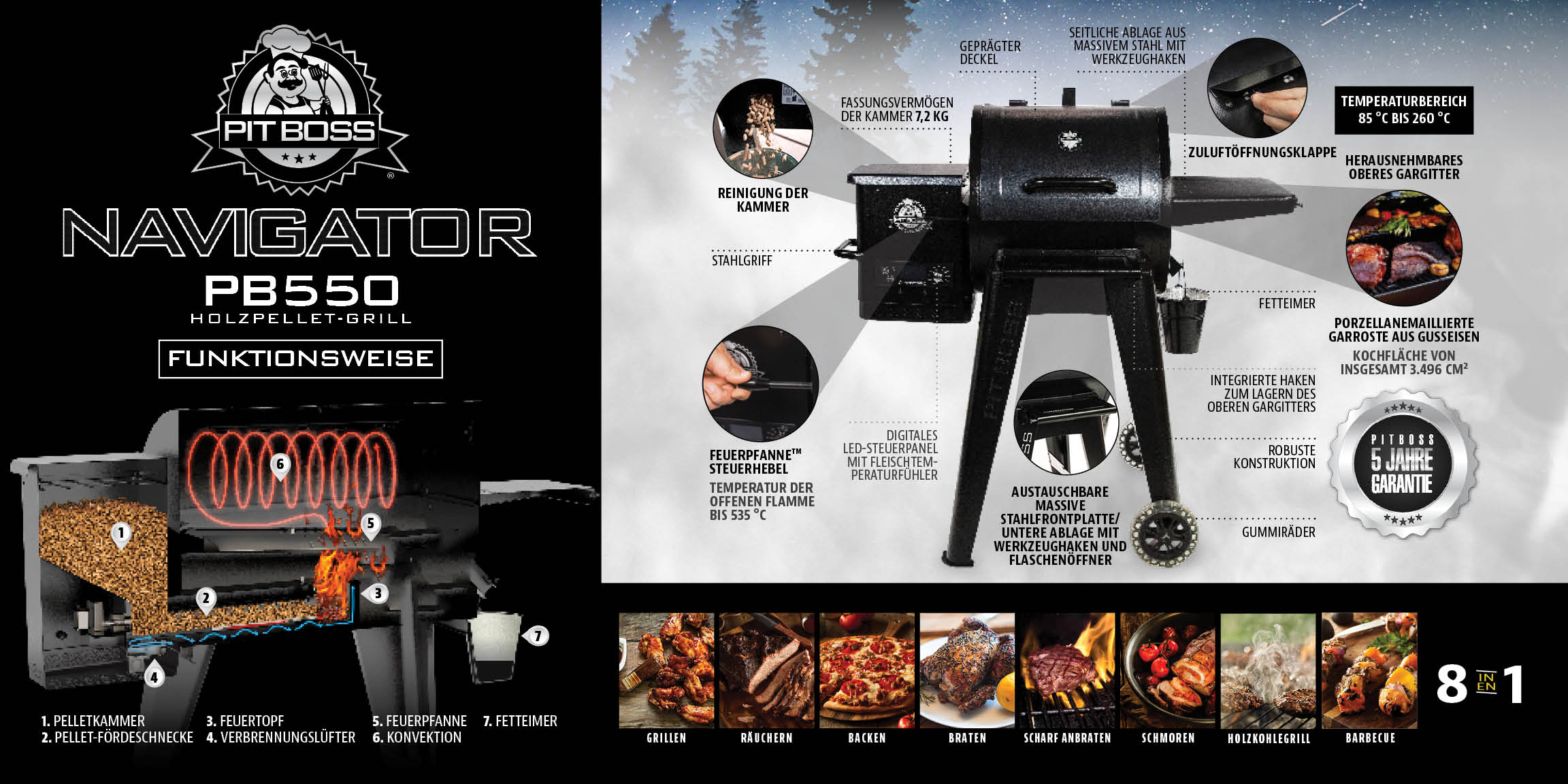 Der Pit Boss Navigator 550 ist ein vielseitiger Pelletgrill für echte BBQ-Fans, die Wert auf Geschmack, Komfort und Leistung legen. Perfekt für Grillabende mit Freunden, lange BBQ-Sessions und authentisches Holzfeuer-Aroma direkt im eigenen Garten.