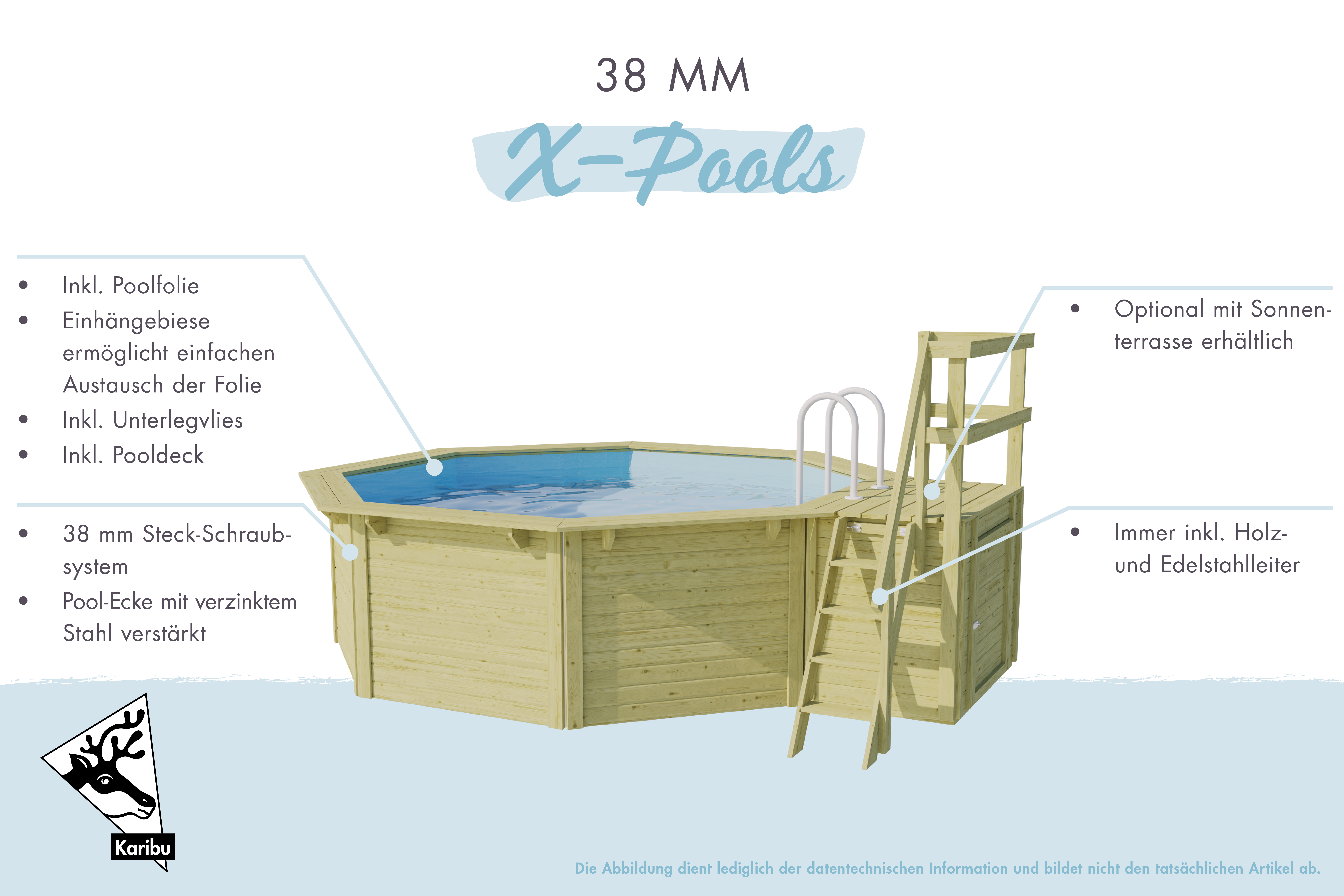 Unser Pool X ist in drei verschiedenen Größen erhältlich. Den Pool selber gibt es sowohl in kesseldruckimprägniertem Fichtenholz oder behandelt in wassergrau. Somit haben Sie die Wahl Ihren Sommerbegleiter individuell zu gestalten. Ein weiteres Highlight ist die Metallecke des Pools. Sie verdeckt unschöne Kanten und Schrauben und schützt gleichzeitig das Holz vor Witterungseinflüssen. Im Lieferumfang enthalten ist außerdem der Bodenschutzvlies, eine Holz- und Edelstahlleiter sowie die gewählte Poolfolie. Egal ob für Familie oder Freunde: ein Pool ist im Sommer nicht wegzudenken! An einem warem Sommertag gibt es nichts Schöneres, als sich im eigenen Garten abkühlen zu können. Bei der Poolsäuberung hilft Ihnen ein Saugroboter und im Winter bietet eine Winterabdeckfolie den nötigen Schutz vor der Kälte. Auch für ein bisschen Urlaubsfeeling kann das Modell sorgen. Ein paar Palmen in der Nähe des Pools, mit ein bisschen Sand einen kleinen Privatstrand schaffen, zwei Liegestühle für den nötigen Komfort. Lassen Sie die Seele baumeln und träumen Sie sich jetzt schon in Ihren nächsten Urlaub mit dem Pool X.