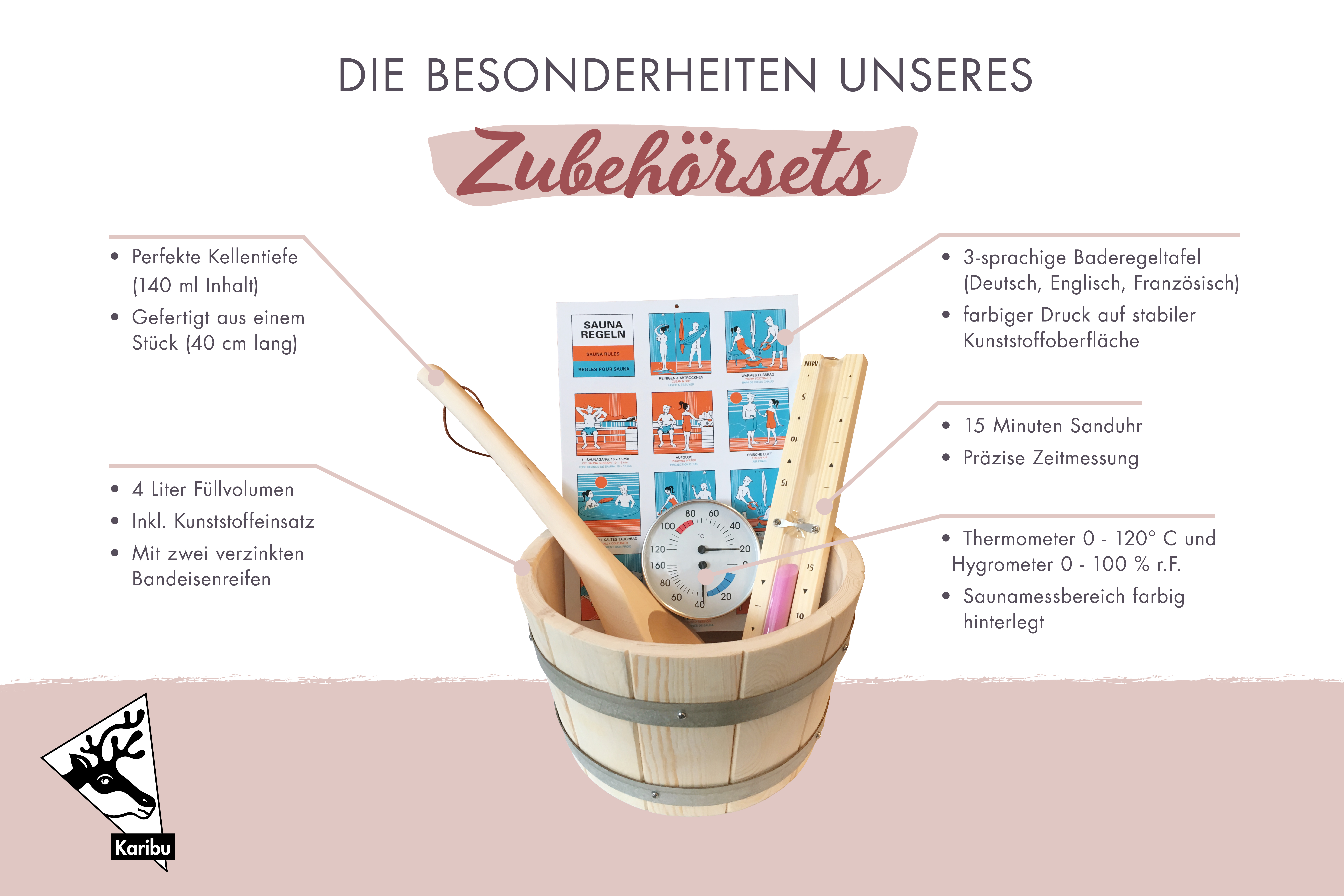 Dieses Saunazubehör Set beinhaltet alles was man für einen Saunagang benötigt. Der Aufgusskübel mit Kunststoffeinsatz sowie die Schöpfkelle ermöglichen einen knackigen Aufguss. Zur Kontrolle des Saunaklimas gehört der Klimamesser ebenfalls zum Lieferumfang sowie auch Sauna-Baderegeltafel und eine Sanduhr.