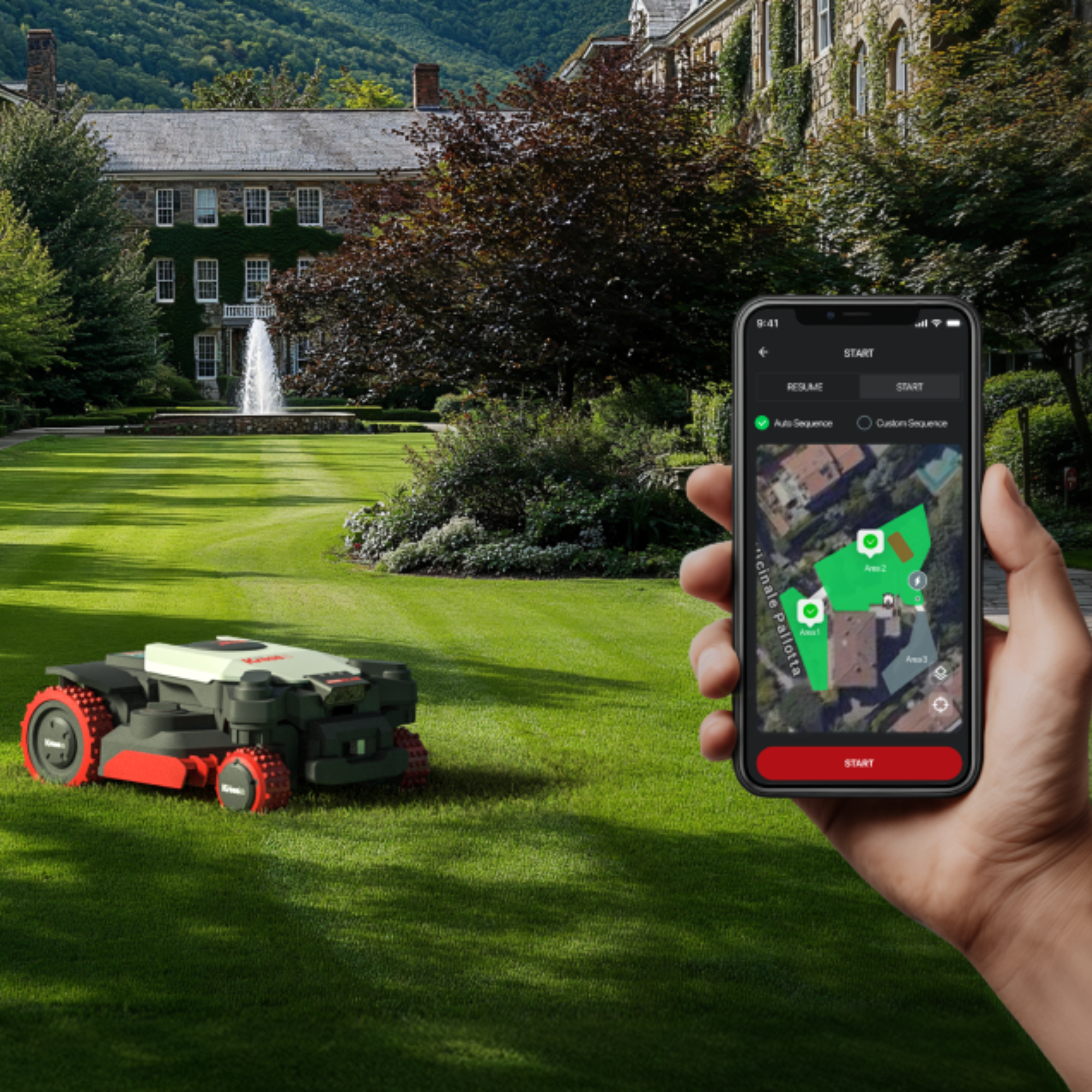 • Kein Begrenzungskabel notwendig – ideal für große, komplexe Grundstücke