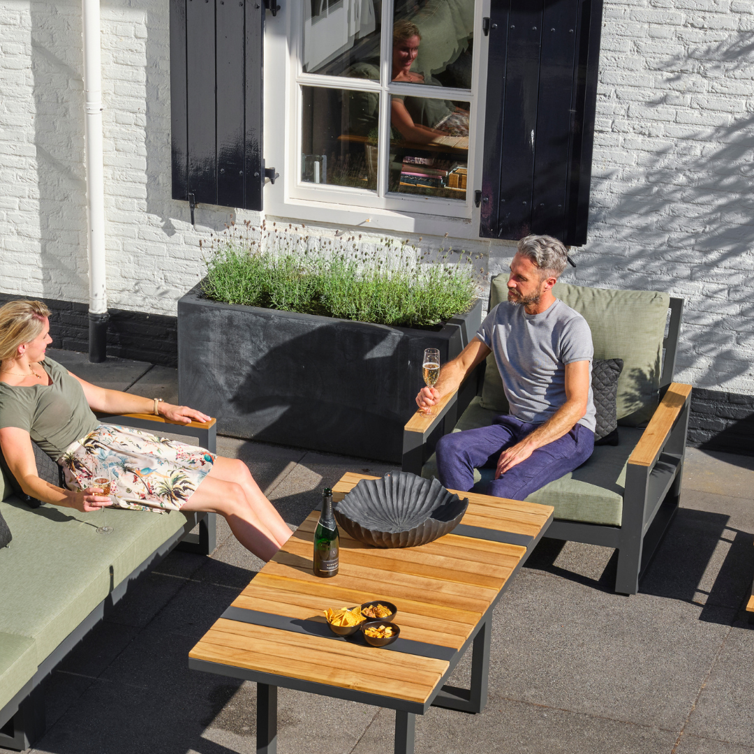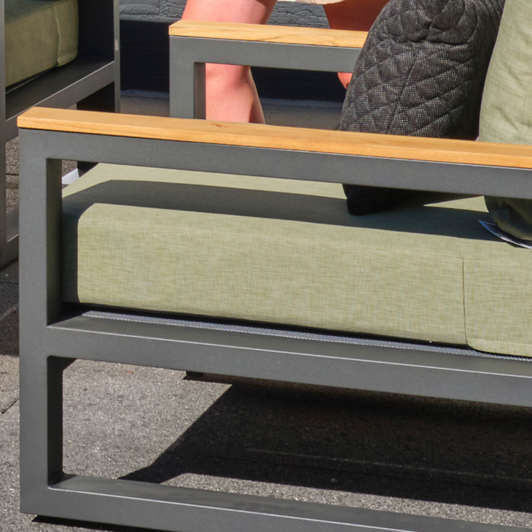 Die Soho Lounge Sets bestechen durch ihr modernes Design aus Aluminiumrahmen und Teakholzarmlehnen. Der stabile und sehr robuste Rahmen wird ihnen viele Jahre Freude bereiten. Die Rahmenfarbe in Lava ist zeitlos und elegant. Die Auflagen sind wahlweise in grau oder olive erhältlich. Die Soltex-Allwetter-Kissen fühlen sich sehr weich und natürlich an. Sie sind robust und sehr pflegeleicht. Sie können die gesamte Frühjahr- und Sommersaison über draußen bleiben. Für Herbst und Winter empfehlen wir die Aufbewahrung im Innenbereich. Diese Kissen werden aus hochwertigem synthetischem Material gefertigt und sind wasserabweisend.