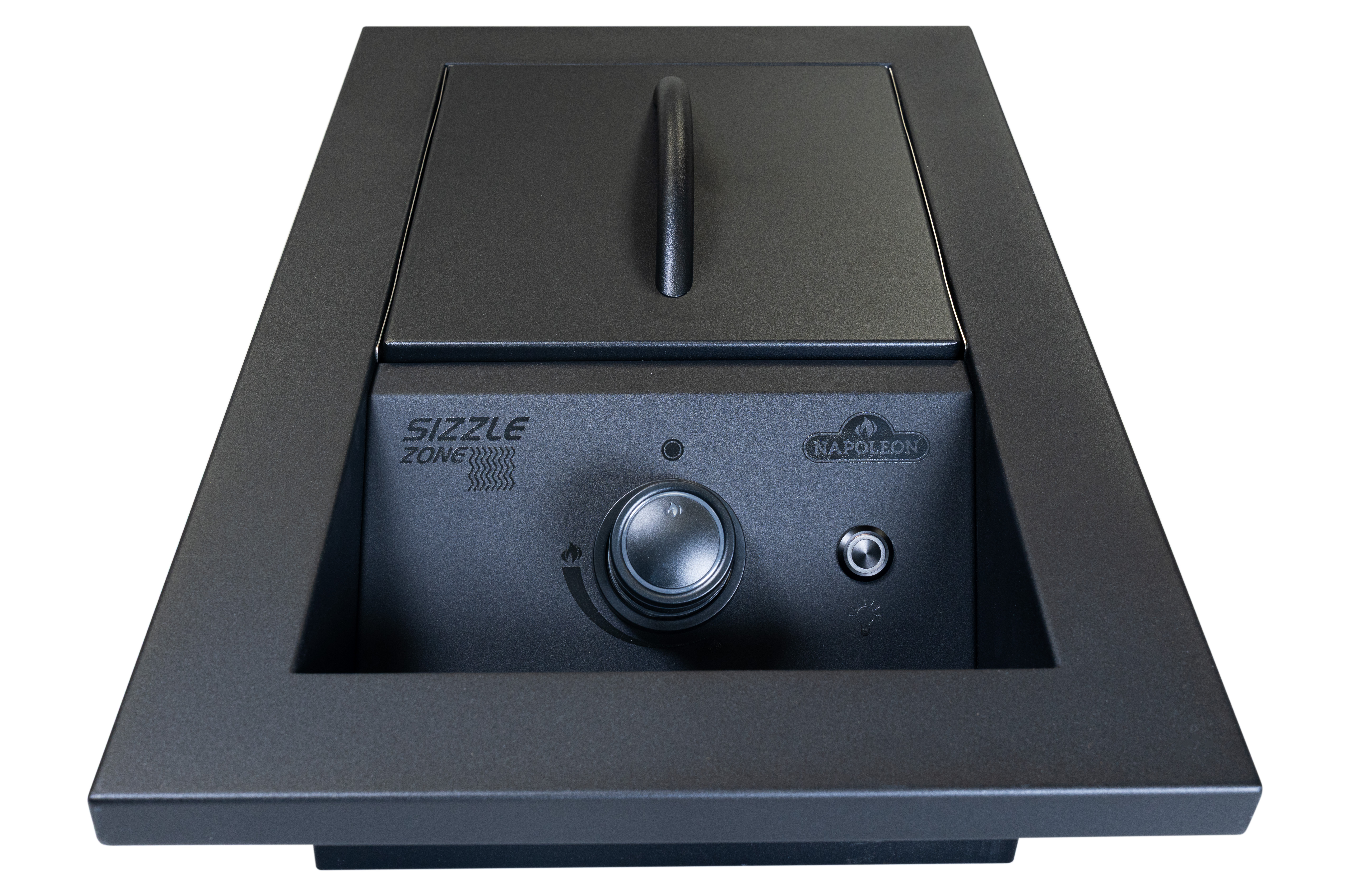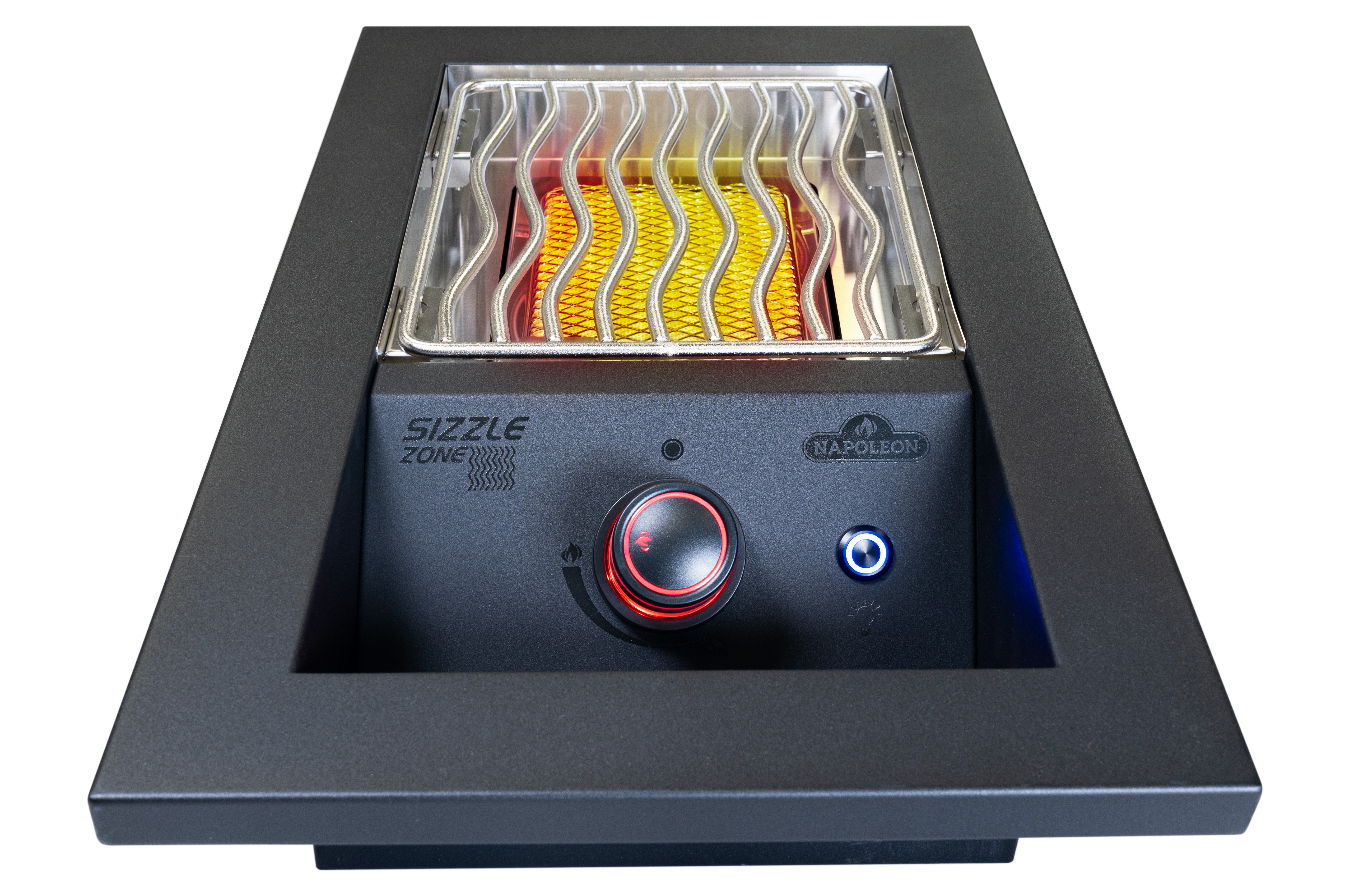 Dieser mattschwarze SIZZLE ZONE™-Infrarotbrenner kann zum perfekten Anbraten von Fleisch oder zur Zubereitung von Beilagen und Saucen verwendet werden, während gleichzeitig der Hauptgrill benutzt wird. In diesem 10-Zoll-Einschub-SIZZLE ZONE™ können Sie perfektes, saftiges Fleisch in Steakhouse-Qualität anbraten. Der Drop-in-Seitenbrenner ist aus demselben hochwertigen Edelstahl in robustem Design gefertigt wie die integrierten Grills der 700er-Serie und passt ideal zu Ihrer individuellen Outdoor-Küche. Dieser Brenner ist langlebig und lässt sich mühelos installieren. Nahezu wartungsfreie Grillroste mit einem Durchmesser von 7,5 mm sorgen für die typischen Grillstreifen, an denen Sie leicht erkennen können, dass es sich um einen echten Napoleon-Grill handelt. Mit dem JETFIRE™-System zünden Sie die Brenner sofort und mit einer Hand. Die blau leuchtenden Bedienelemente schaffen ein schönes Ambiente und sorgen für Sicherheit. Sie werden rot, sobald die Regler aufgedreht werden. Für alle integrierten Brenner der Serie 700, die in einer Anwendung ohne integrierten Grill der Serie 700 verwendet werden, ist der Stromversorgungssatz N370-1092-SER erforderlich, um die Bedienelemente mit Strom zu versorgen.