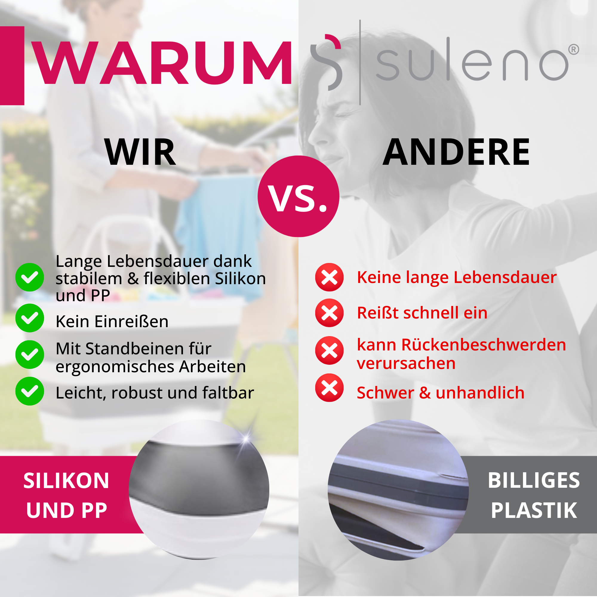 • Stabile Klappfüße: Erhöhte Arbeitshöhe schont den Rücken und erleichtert Waschen, Sortieren und Reinigen.