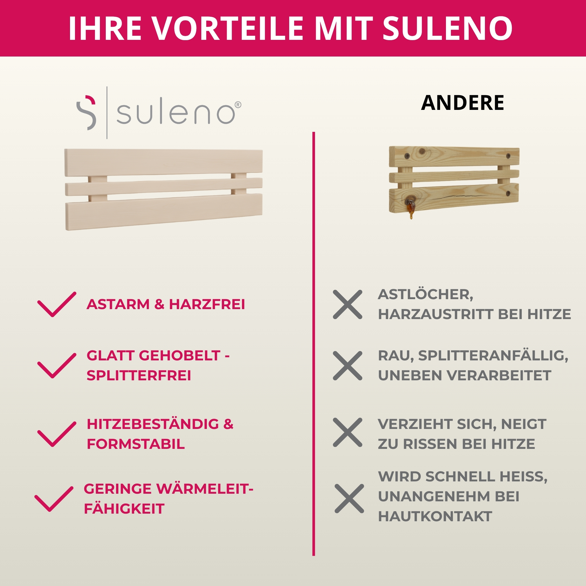 Mehr Ordnung, mehr Hygiene, mehr Sauna-Komfort. Das Suleno Sauna Bankblenden Set Larvik sorgt für einen sauberen, geschützten Abschluss Ihrer Saunabänke und verleiht Ihrer Sauna ein harmonisches, natürliches Erscheinungsbild – für ein rundum gepflegtes Saunaerlebnis.omfort, mehr Hygiene, mehr Sauna-Genuss. Das Suleno Sauna Rückenlehnen Set Larvik bietet Ihnen eine angenehmere Sitzposition und schützt zugleich die Saunawand – für ein sauberes, natürliches und entspannendes Saunaerlebnis.