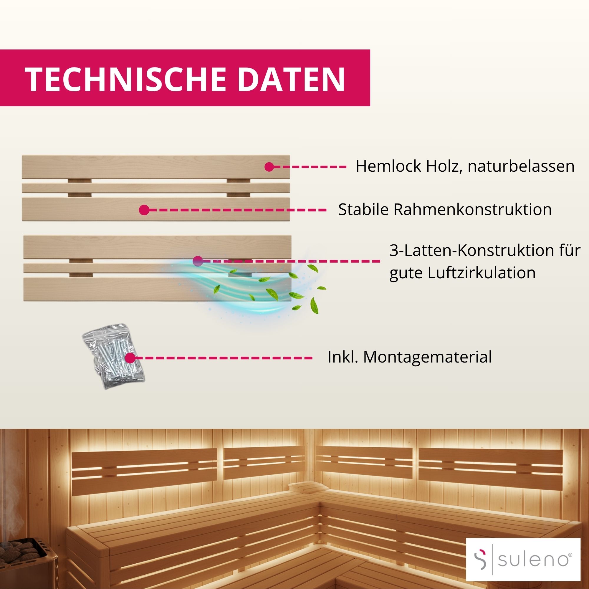 Suleno Sauna Rückenlehnen Set Serie: LARVIK – Komfortabler Wand- und Hitzeschutz aus naturbelassenem Hemlock-Holz