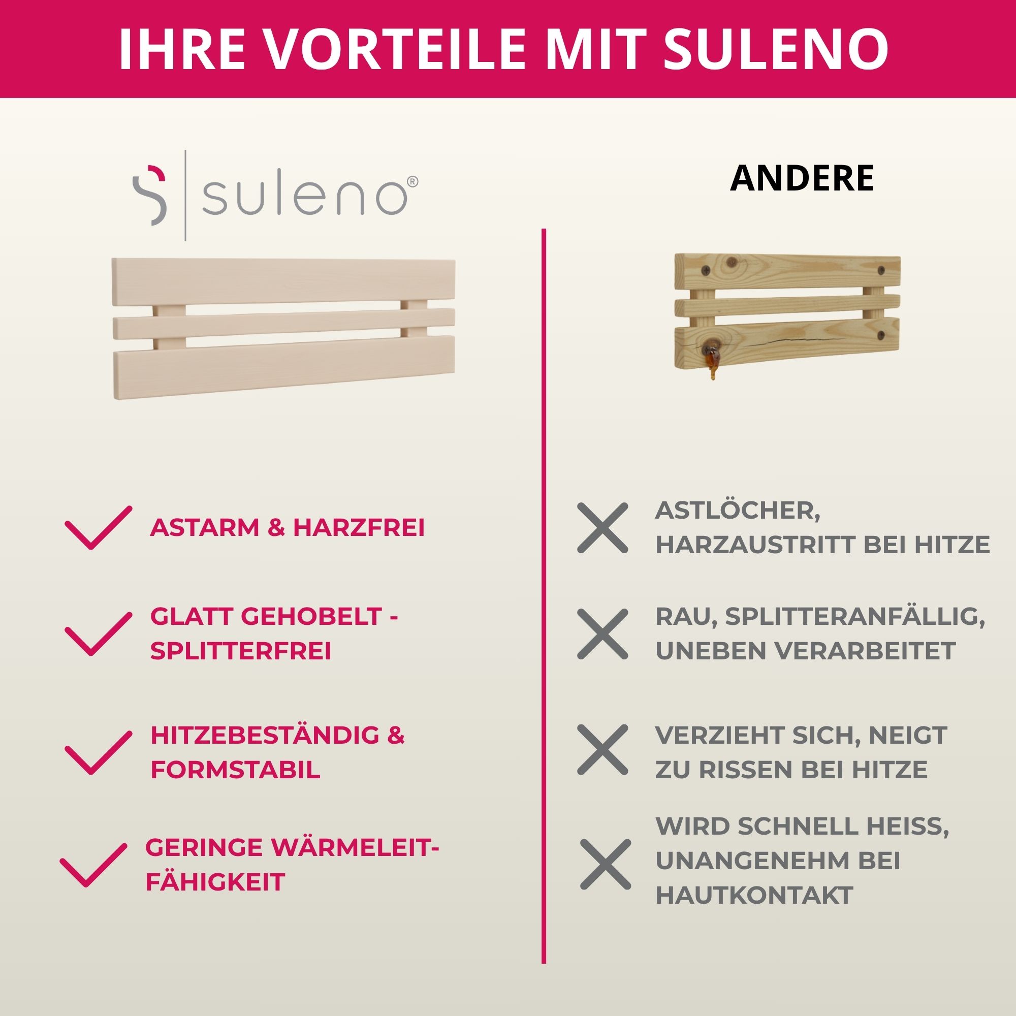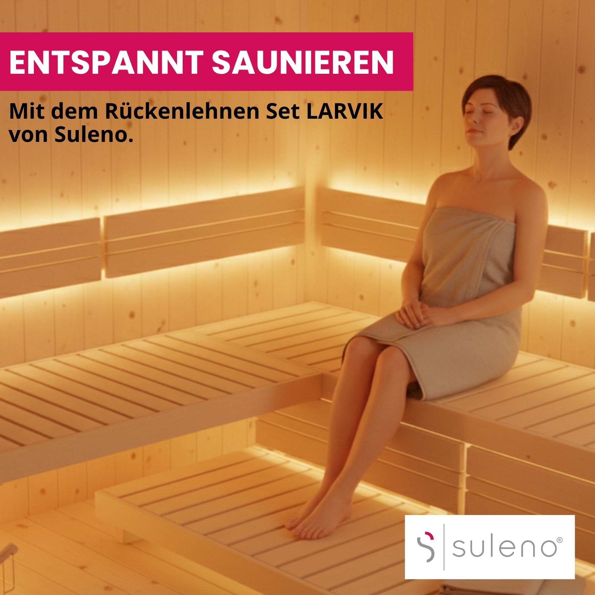 Mehr Komfort, mehr Hygiene, mehr Sauna-Genuss. Das Suleno Sauna Rückenlehnen Set Larvik bietet Ihnen eine angenehmere Sitzposition und schützt zugleich die Saunawand – für ein sauberes, natürliches und entspannendes Saunaerlebnis.