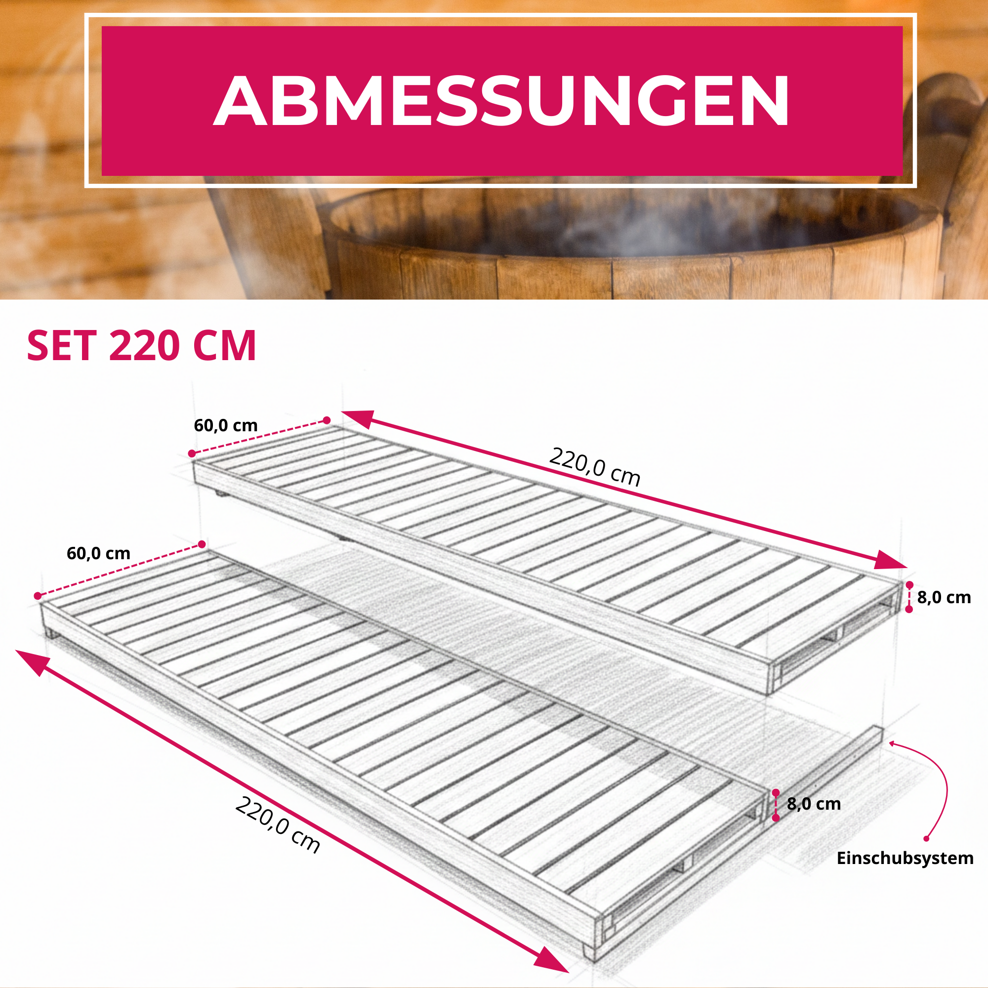 • 2 Saunaliegen (Längen wählbar: 146 / 183 / 220 cm, Breiten: 50 oder 60 cm)