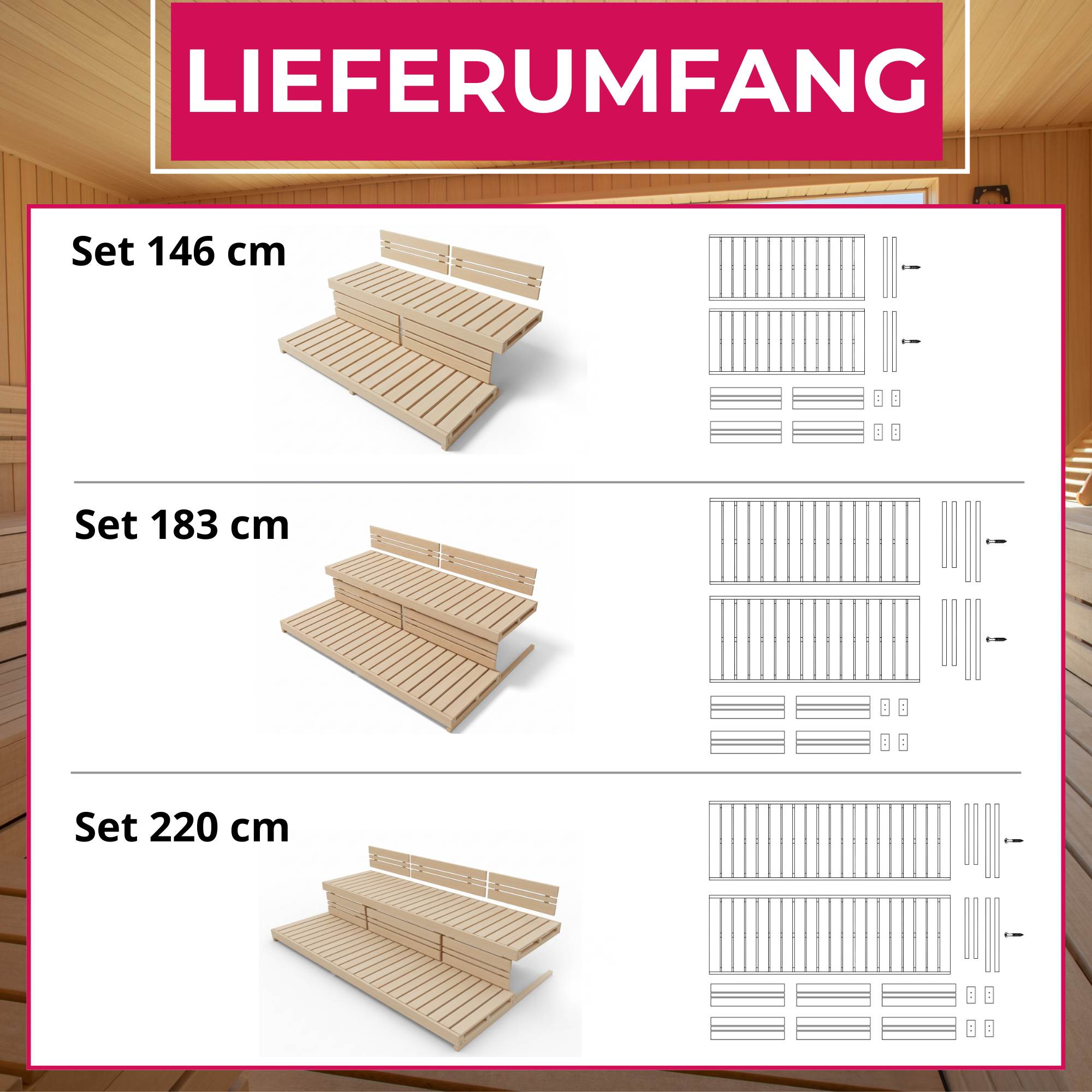 Besonders praktisch: Sowohl die Saunaliegen als auch die Rückenlehnen und Bankblenden lassen sich individuell kürzen und flexibel positionieren. So passt sich das Set mühelos an jede Sauna an – egal, ob Standardmaß oder Sonderlösung. Das Set besteht aus zwei Saunaliegen (in drei wählbaren Längen) sowie einem Lehnen-Set, das abhängig von der gewählten Länge eine unterschiedliche Anzahl an Rückenlehnen und Bankblenden enthält.