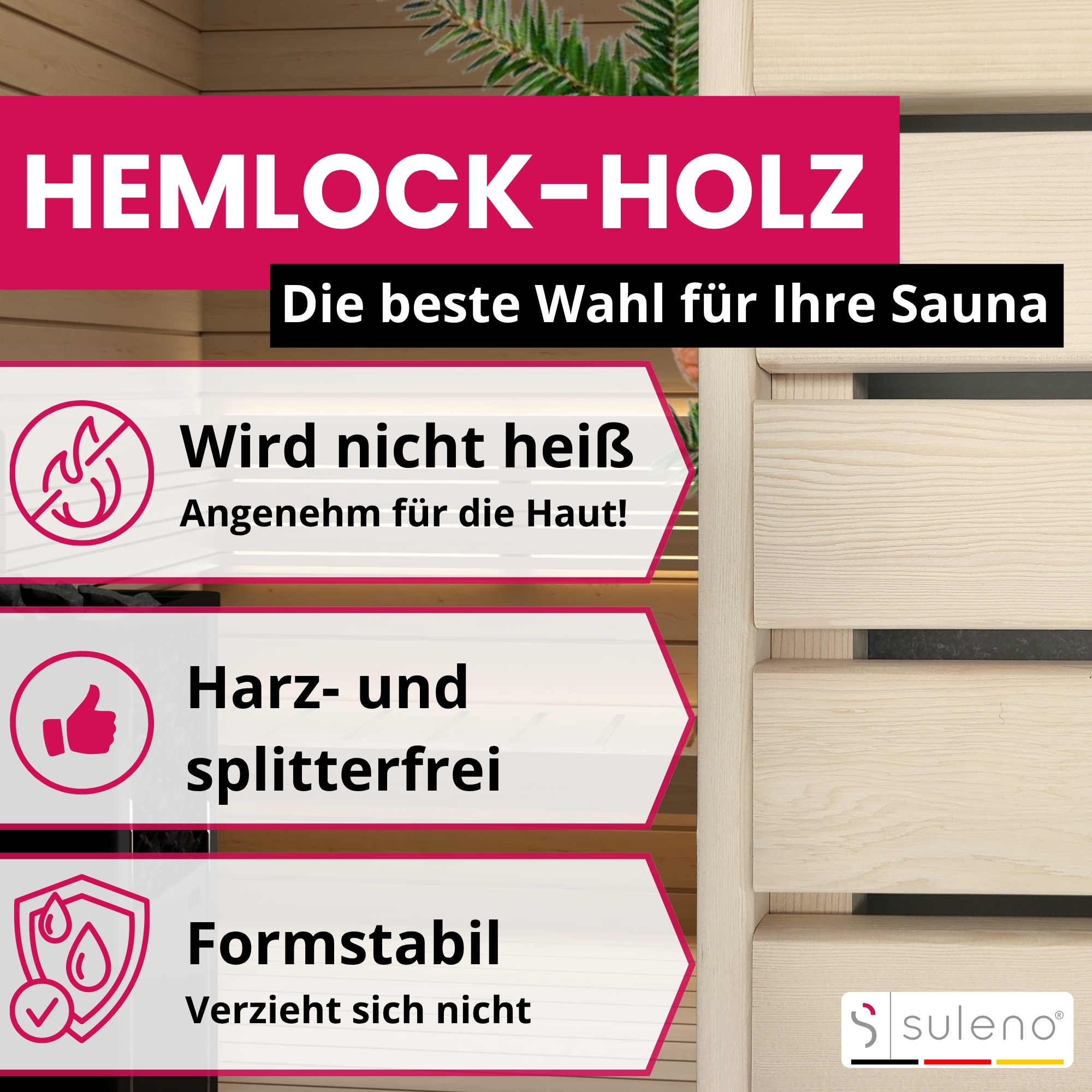 • Natürliches Saunagefühl: Hemlock-Holz überzeugt durch angenehme Wärme, glatte Oberfläche und dezente Duftnote – für pure Entspannung.
