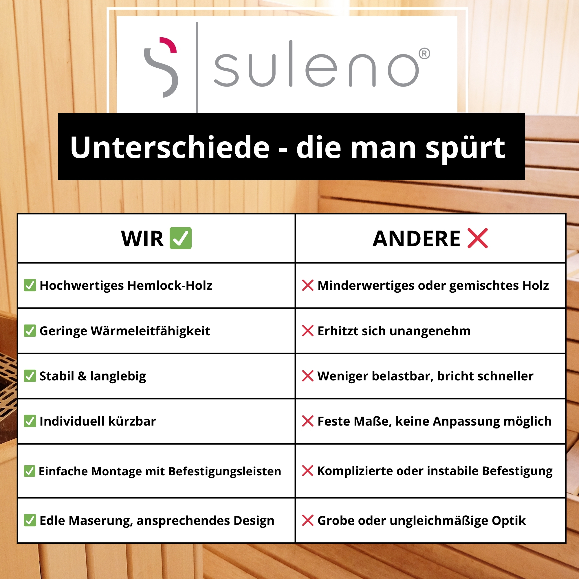 • Individuell anpassbar: Auf Wunsch können Bänke und Rückenlehnen millimetergenau auf Maß gekürzt werden – ideal für Sondergrößen oder bestehende Saunen.
