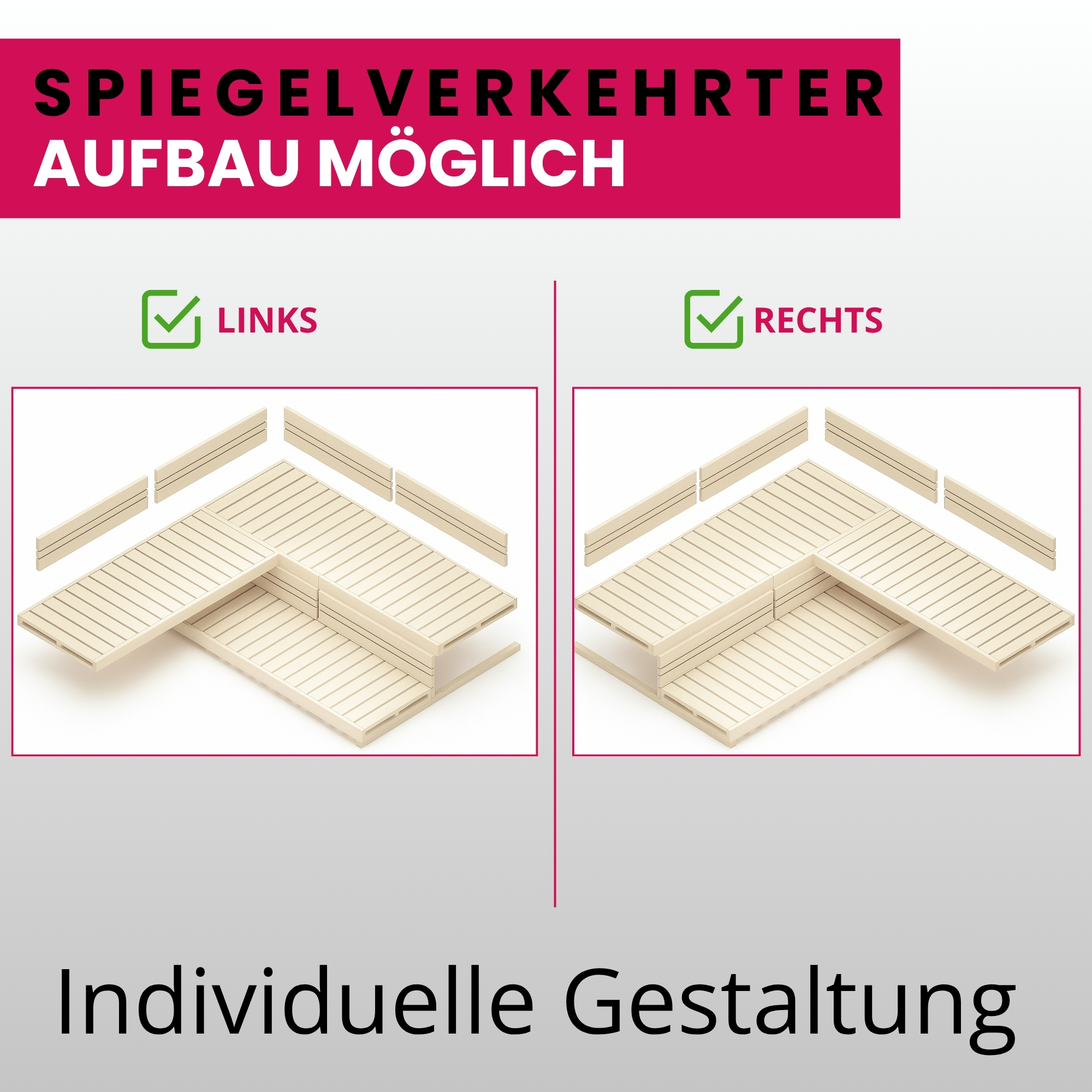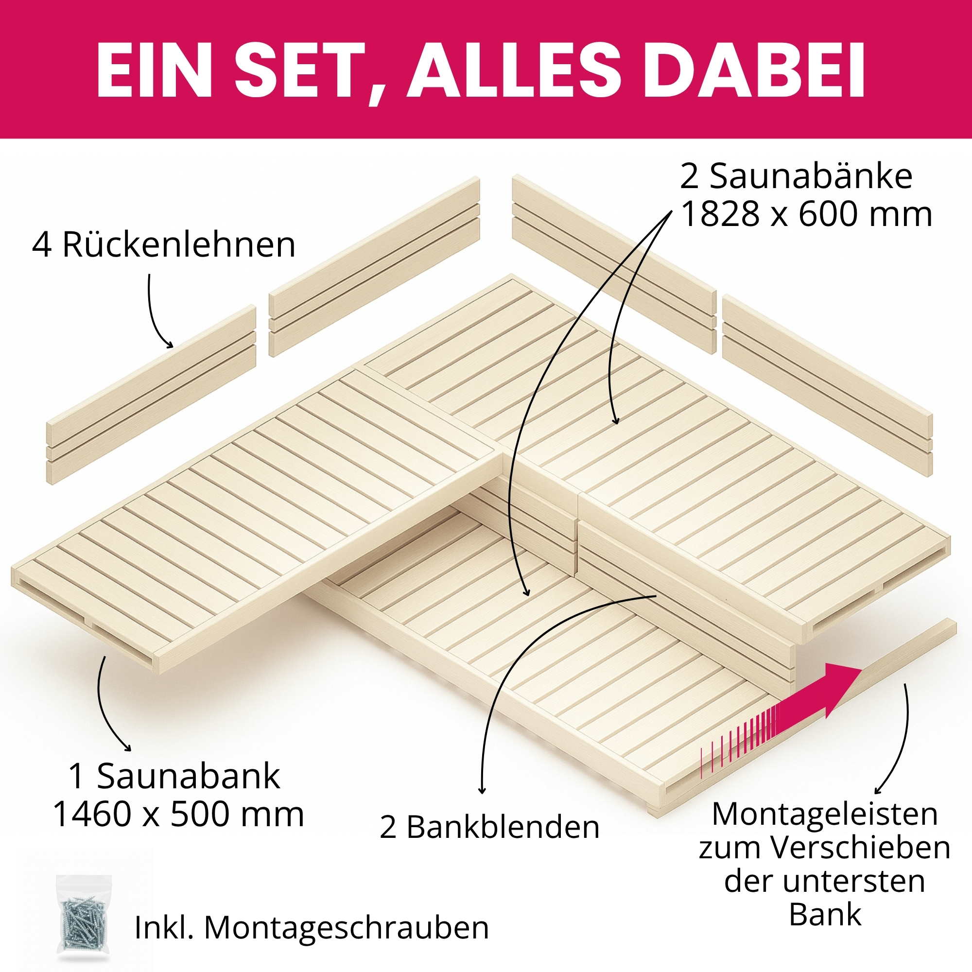 • Perfekte Ecklösung: Drei Saunabänke, zwei Rückenlehnen und eine Blende bilden eine harmonische Einheit für Saunen bis 220 × 206 cm.