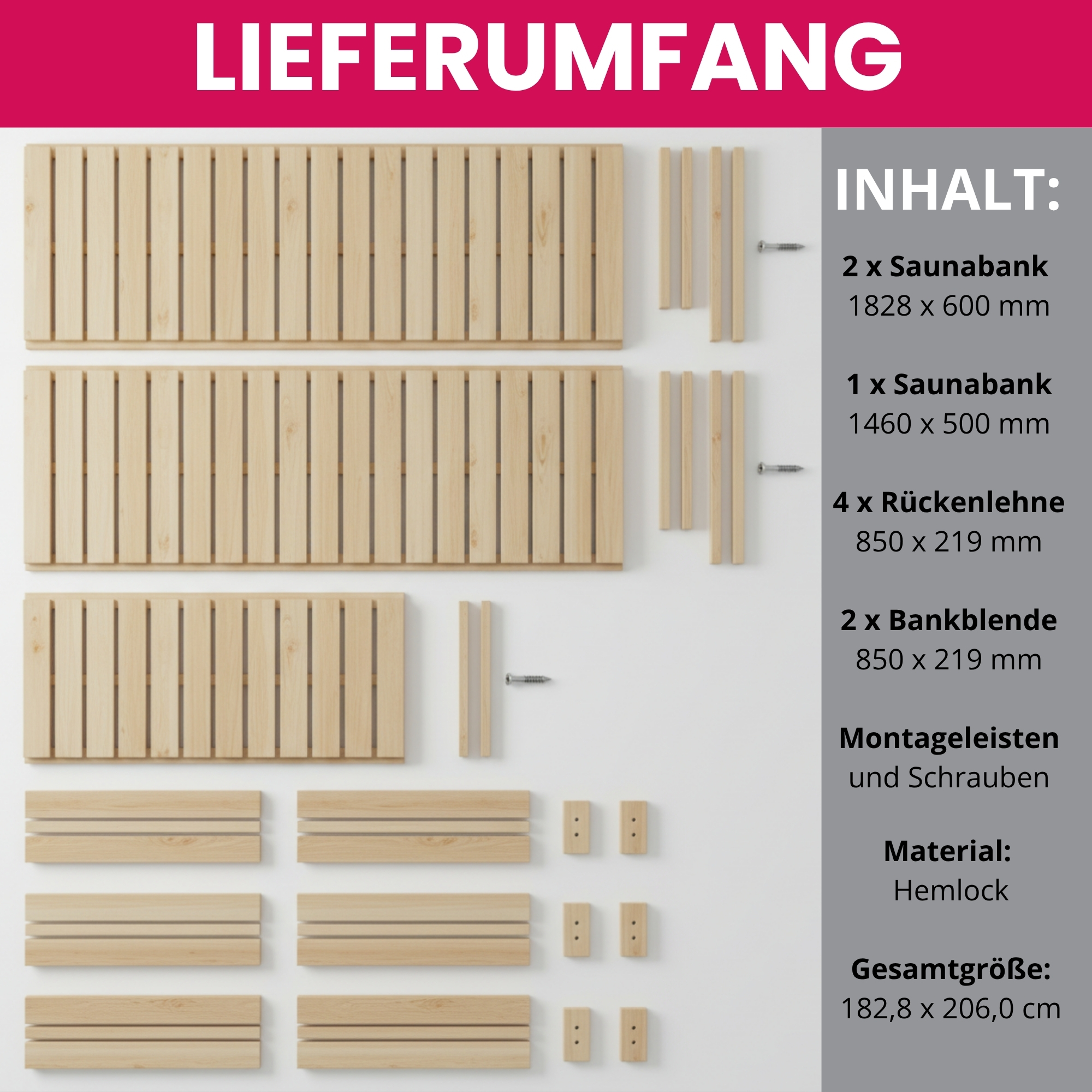 Saunabank Set VISBY – Komplettset für Saunen bis 220 × 206 cm aus Hemlock-Holz